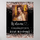 Um poster de boas-vindas para uma festa de aniversário de 21 ruas (ou qualquer idade) entre giros e glamourosos. Um fundo na moda preto decorado com um confete rosa dourado. Personalize e adicione uma foto, nome e idade 21. Cartas brancas. Bem-vindo é escrito com coração.