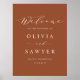 Bem-vindos convidados para o seu evento com este personalizável sinal de boas-vindas. Apresenta uma escrita de terracota e uma tipografia simples. Personalize adicionando seus detalhes. Este sinal de boas-vindas de boho é perfeito para qualquer tema de casamento e estação.