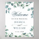 Bem-vindos convidados para o seu casamento com Watercolor Eucalyptus Greenery Wedding Poster de Boas-vindas, apresentando uma cor aquática brilhante verde botânico e flores brancas, com "bem-vindos a nossa felicidade para sempre", seus nomes, e data de casamento em uma mistura chic de blocos modernos e letras caligráficas manuais.