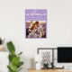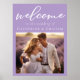 Esta adorável poster de boas-vindas do casamento lilás mostra uma bela tipografia branca sobre um fundo roxo macio sobre a sua fotografia de noivado de um primavera à tarde. O decoro pastel de lavanda é uma escolha de cor delicada para uma ocasião elegante de jardim.