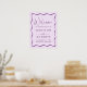 Bem-vindos aos seus hóspedes com encanto moderno usando este Poster de Boas-vindas do Purple Wavy Frame. Seus nomes e detalhes de casamento aparecem em letras roxas em um fundo roxo leve, enquadrado por uma borda ondulada em negrito para um ponto focal de na moda. Perfeito para primavera, lavanda ou casamentos brancos, este poster de boas-vindas adiciona um toque novo e elegante à sua decoração. Disponível como um poster impresso profissionalmente ou como um download instantâneo para impressão em casa.