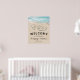 Poster de boas-vindas para o casamento de destino de praia, com uma praia de areia vintage com dois corações na orla costeira, suas iniciais e um modelo de texto bem-vindo.