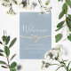 Poster de boas-vindas elegante, moderno, minimalista e empoeirado ao casamento azul com corda de ouro falso e simples escrita à mão.