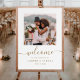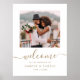 Sinal moderno de boas-vindas ao casamento (poster) com uma caligrafia elegante dourada e uma fotografia. Para personalização mais avançada deste design, clique no link Personalizar Mais para alterar a fonte, o tamanho e a cor.