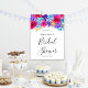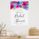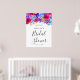Flores de hortênsia azul brilhante, rosas roxas profundas e flores tropicais rosa magenta brilhante criam um arranjo floral vibrante. Chá de Noiva é escrito em caligrafia moderna. Este sinal de boas-vindas faz parte da Coleção Rosa Roxo Azul Ousado.