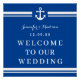 Poster / cartaz do Marinho náutico Elegante Monograma Boas-vindas Poster náutica Personalizada com o tema "Bem-vindo ao nosso Casamento", destinado a ser exibido no dia do casamento de verão. Texto personalizado branco e cor de fundo azul marinho. Personalize a âncora do barco, a design de monograma da corda com a noiva e as iniciais do noivo, os nomes e a data do casamento. As faixas horizontais destacam o design.
