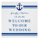 Poster / cartaz do Marinho náutico Elegante Monograma Boas-vindas Poster náutica Personalizada com o tema "Bem-vindo ao nosso Casamento", destinado a ser exibido no dia do casamento de verão. Texto personalizado azul marinho e cor branca de fundo. Personalize a âncora do barco, a design de monograma da corda com a noiva e as iniciais do noivo, os nomes e a data do casamento. As faixas horizontais destacam o design.