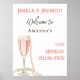 Um sinal de boas-vindas para uma festa de aniversário. Um fundo branco chic. Decorado com um copo de bolhas cor-de-rosa e pérolas. Personalize e adicione um nome. Letras pretas e ouros.