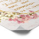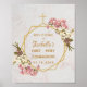 Este poster de primeira comunhão geométrico floral, recomendado para a primeira comunhão sagrada de uma menina, tem um quadro de ouro irregular com buquês de flores de orquídeas brancas e cor-de-rosa para cima, para a direita e para baixo, sobre dois hexágonos de ouro que se sobrepõem por um fundo de mármore branco, com uma cruz de ouro no topo. Todo texto é dentro do quadro dourado e tem uma cor ouro amarela, como o quadro dourado. O nome da criança é escrito em um roteiro caligráfico elegante. O buquê de flores com orquídeas cor-de-rosa e brancas é de um cartão postal antigo de Bertha Maguire (1862-1910), agora no dominio público.