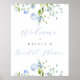 Um belo cartaz de boas-vindas de noiva com flores em aquarela azul claro, pronto para ser emoldurado, ou encomende como download instantâneo.