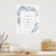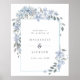 Um elegante poster de boas-vindas do casamento com uma moldura de drangeas azuis em cascata e folhas sobre fundo branco.