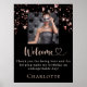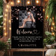Uma poster de boas-vindas para uma festa de aniversário. Um fundo preto clássico decorado com estrelas douradas rosa. Personalize e adicione uma foto, um texto de boas-vindas e um nome. Bem-vindos com o coração.