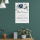 Boas-vindas para pôster de jantar de ensaios com flores azuis empoeiradas, apresentando um buquê elegante de azul-marinho, azul-real, branco, dourado, marfim champanhe, rosa cor-de-rosa, botões de flor de ranúnculo e folhas de eucalipto verde-sage e buquê de aquarela elegante. Por favor, entre em contato comigo para qualquer ajuda na personalização ou se você precisar de qualquer outro produto com este design.