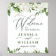 Bem-vindos convidados para o seu casamento com Watercolor Eucalyptus Greenery Wedding Poster de Boas-vindas, apresentando uma cor aquática brilhante verde botânico e flores brancas, com "bem-vindos a nossa felicidade para sempre", seus nomes, e data de casamento em uma mistura chic de blocos modernos e letras caligráficas manuais.