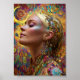 Poster of a gypsy style woman who embodies magic and beauty. Immerse your space in color and magic with this stunning Bohemian Cosmic Goddess art print. This vibrant poster features a serene woman bathed in golden light, her eyes closed in peaceful bliss, surrounded by a kaleidoscope of intricate floral and celestial patterns. Her hair is adorned with jeweled ornaments and shimmering details, blending seamlessly into a radiant background of swirling colors, moons, and stars.