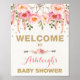 Belo sinal de boas-vindas ao chá de fraldas com tema boêmico, com destaque para a melancolia feminina, marca-gotas florais a rosa e ouro