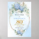 Celebre 80 anos maravilhosos com este sinal de boas-vindas de hortênsias em aquarela. As flores azuis desbotadas e douradas criam um cumprimento suave e elegante, perfeito para uma festa de 80 anos. Os acentos de eucalipto boho e tons pastéis trazem beleza atemporal para a sua celebração.