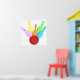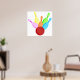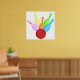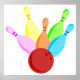 Simples ilustração de dez escarpas coloridas de boliche de dez pinos sendo derrubadas por uma bola de boliche. Imagem disponível em vários presentes e produtos. Posters. Impressões.