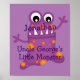 Aqui está um monstro roxo giro com olhos grandes, dentes afiados, e manchas laranja, tudo sobre fundo lavanda. É cheio de diversão e quer ser o amigo engraçado do seu pequeno monstro. Quer você seja mãe, Pai, tia, tio, avó, ou Madison, a babá, você pode adicionar o nome do jovem e o seu, e eles terão um poster personalizado de desenho animado de criança que é tudo seu.