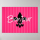 A palavra "Bonjour", com o "j" pontilhado com um coração, encontra-se sobre uma silhueta preta de pulgas-de-lis colocada sobre um padrão de fundo de listras cor-de-rosa escuras e mais claras.