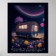 O poster para amantes de livros apresenta IA gerou paisagem de sonho de arte digital com um móvel iluminado em um campo de flores sob o céu noturno. "Encontre-me sob as estrelas e podemos ler todos os nossos livros proibidos favoritos juntos" o texto pode ser personalizado para sua própria mensagem especial