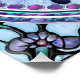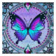 Uma borboleta vibrante com tons de azul e roxo é centrada dentro de um design circular ornamentado, cercada por intrincados padrões florais e joias decorativas. A composição total expele uma estética de vidro manchado com uma mistura harmoniosa de cores e simetria.