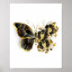 Borboleta de flor dourada com orquídea de jóias pretas, decorada com folhas de ouro em fundo branco.