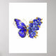 Borboleta de flores cinza, azul, safira, espumante com asa decorada com flores preciosos azuis com folhas de ouro sobre fundo branco.