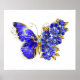 Borboleta de flores cinza, azul, safira, espumante com asa decorada com flores preciosos azuis com folhas de ouro sobre fundo branco.