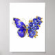 Borboleta de flores cinza, azul, safira, espumante com asa decorada com flores preciosos azuis com folhas de ouro sobre fundo branco.