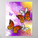 Laranja, borboletas monarcas detalhadas sobre luz, roxo, pitoresco, fundo pintado.