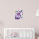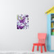 Design original criado com uma ilustração da safra com borboletas roxas sobre um ramo das folhas e um fundo floral azul claro.
