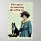 Esta poster engraçada mostra uma mulher com roupas antigas. Ela parece que está amassando o nariz. Ela está ao lado de um Boston Terrier. A bolha de pensamento diz "Temos que fazer algo sobre esse gás"