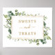 Este doce de casamento e trata a placa de mesa de sobremesa apresenta cores aquáticas pintadas de eucalipto verde, folhas verdes com uma estrutura de retângulo dourado. Perfeito para casamentos, chás de panela, chás de fraldas, aniversários e outros eventos. Para personalização mais avançada deste design, clique no link "Personalizar mais". Itens correspondentes também estão disponíveis.