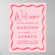 Faça uma primeira impressão corajosa com este Poster de Boas-vindas do Modern Pink e do Red Wavy Frame. Seus nomes e detalhes de casamento aparecem em letras vermelhas em um fundo cor-de-rosa suave, enquadrado por uma fronteira ondulante impressionante para um olhar moderno, mas romântico. Perfeito para casamentos no dia do Namorados, cerimônias de primavera, ou casamentos ousados, este poster de boas-vindas dobra como decoração e como uma pausa na moda. Escolha impressão profissional ou faça o download instantaneamente para o impressão em casa.