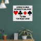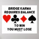 Mostre sua ponte tortuosa/lado do jogador de ponte duplicado com este poster que apresenta os quatro naipes de placa junto com a seguinte ponte, dizendo que muitos jogadores de ponte concordarão com: "Bridge Karma Requer Equilíbrio Para Ganhar Você Deve Perder".