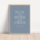 Poster com a citação de Maria Montessori, "Brincar é a Obra da Criança" em tons de azul.