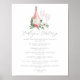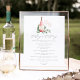 Charmoso cardápio de degustação de vinhos botânicos exibe suas seleções de vinhos encimadas por uma garrafa de vinho rosé com as iniciais do casal inscritas e dois copos de vinho sobre uma cama de folhas de eucalipto e folhagens em aquarela verde. Projetado para combinar com nossa coleção de convites Cheers to Love.