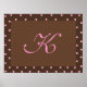 This print is in chocolate browns and pink; a dark chocolate brown border with pink polka dots, and a pink customizable monogram in the center.