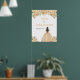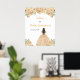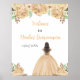Esta poster de boas-vindas da Quinceanera apresenta flores florais de creme de champanhe de falso brilho, e uma bela princesa com cabelo castanho e um vestido elegante. Isto é perfeito para uma festa de aniversário de Quinceanera.