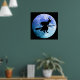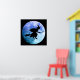 Uma bruxa está voando sobre uma lua de cheio no Halloween