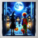 Poster do Dia das Bruxas Assustador com arte ai retratando um garotinho e uma garota em um palhaço e um traje de bruxa saindo da casa para encontrar um monstro assustador no final de sua calçada.