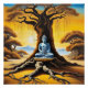 A I.A. interpretação criada de um Buda sereno é representada meditando sob uma grande árvore com raízes e ramos extensos. As matizes ouros dominam a paisagem surreal, que apresenta um pano de fundo montanhoso e um pôr ou um sol ascensão atrás do Buda.