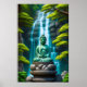 Uma estátua Tranquil Bodha sentada ao lado de uma cachoeira que flui.