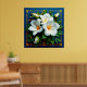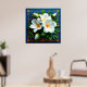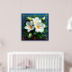 Buquê de flores brancas, belamente arranjado, incluindo grandes flores e delicadas flores menores, colocado sobre um fundo azul profundo com molduras de ouros e cantos decorativos.