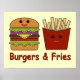 Imagens digitais de um cheeseburger e uma ordem de batatas fritas com rostos bonitos. Abaixo deles está a frase "Burgers and Fries"