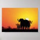 Uma manada de búfalos de Cabo em silhueta contra os incêndios do sol de pôr. Computação de Kathie Miller.
