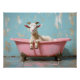 Uma pintura branca com uma cabra branca com chifres relaxando numa banheira rosa vintage, colocada contra uma parede azul clara para uma encantadora e divertida cena rústica.