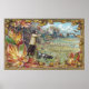 Saudações de Ação de Graças Um homem com uma espingarda e um cão jogou alguns pássaros de caça nesta cena do outono, bordado com folhas de carvalho e carvalho, e bolotas de uma safra de 1910, Cartaz de Ação de Graças.