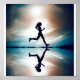 A silhueta de corredor feminino é espelhada abaixo com um céu de sol pastel macio como pano de fundo